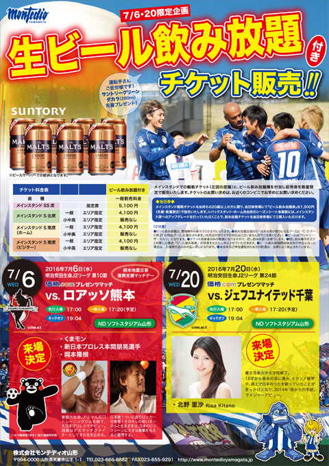 ビールのおいしい季節にモンテディオ山形から朗報です。2016年7月6日(水)ロアッソ熊本戦、7月20日(水)ジェフユナイテッド千葉戦の2試合を対象に、「ビール飲み放題チケット」を販売いたします。是非、お友達や仕事仲間を誘って楽しい夜をお過ごしください。