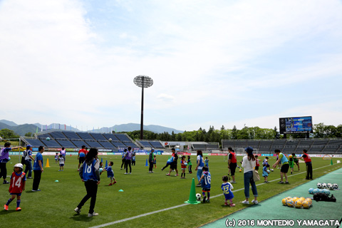 開場前のNDスタで行われたのは、アカデミーサッカースクール体験親子サッカー教室です。年中の子供たちから小学1年生まで、モンテディオとサッカーに興味がある子ども達を対象に行われました。