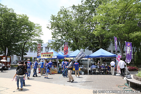 この試合は最上地区8市町村の市町村応援デー。新庄市と金山町は特設ブースを設置して、特産の美味いものの販売やPR活動を展開します。