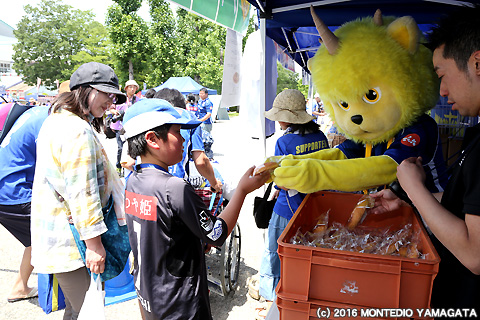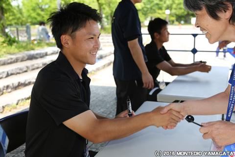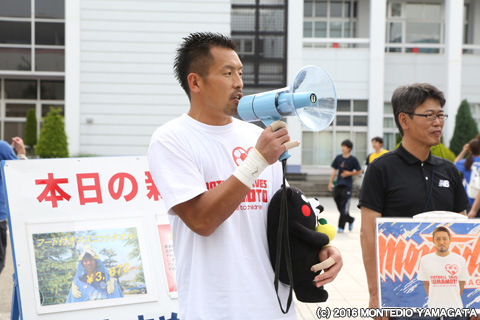 試合終了後、急遽山岸範宏選手は熊本チャリティTシャツ販売に参加します。このTシャツは平成28年熊本地震に対するチャリティ活動として熊本県出身及び熊本県にゆかりのあるJリーガー21名が熊本の子どもたちをロアッソ熊本のホームゲームに招待するために販売するというもので、モンテディオ山形では本活動に賛同し販売協力を行っています。ぜひ引き続き、皆様のご協力をお願い致します。