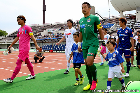 両チームのキャプテンを先頭に選手の入場です。ともにゴールキーパーで、モンテディオ山形は言わずもがなの山岸範宏選手、そしてカマタマーレ讃岐は10年にわたり山形のゴールを守り続けた清水健太選手です。