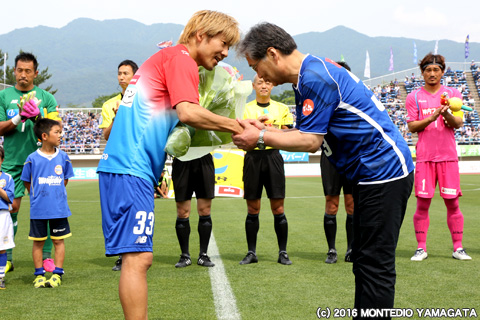 キックオフ前、前々節横浜FC戦でJリーグ通算350試合出場を果たした大黒将志選手に花束の贈呈が行われます。