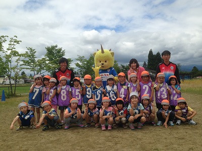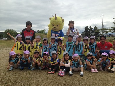 最後にみんなとパシャリ。モンテディオと一緒にサッカーの楽しさを知ってくれたらうれしいです。