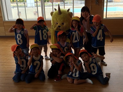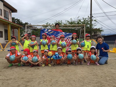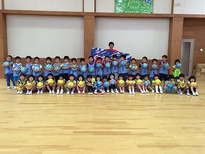 みんなで記念撮影。ぜひ園庭でもサッカーを続けてね!