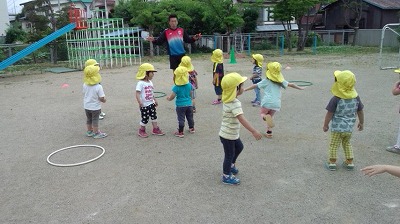 フラフープにぶつからないように。止まるときはかかしさんで。