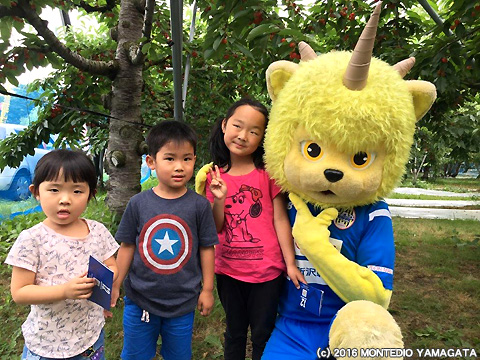 試合のPRも忘れずに!さくらんぼ園へ遊びに来ていた子供たちへしっかりと告知。「山形県内の小中高生は入場無料」なので、ぜひ遊びに来てね!