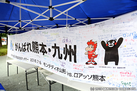 次の試合は4月に予定されるも熊本地震のため延期されていた第10節vs.ロアッソ熊本戦となります。Jリーグ各クラブ・そして各クラブのサポーターも一緒になって熊本支援活動をしていました。その一つがこの応援メッセージを書き込んだ横断幕。皆さんの思いを込めた横断幕は、ロアッソ熊本戦のスタジアム内Fゲート付近に掲示し、試合終了後に選手が横断幕を持ち場内一周。その後、ロアッソ熊本へお渡しします。