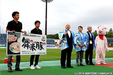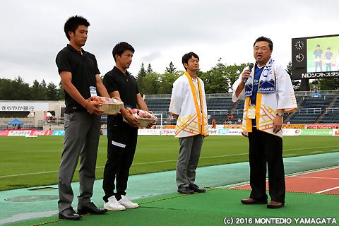 この試合は中山町と山辺町の市町村応援デー。それぞれすもものつかみ取りや舞米豚の炙りフランク販売などのブース出店の他、山辺町からはチームへ舞米豚30kgを、中山町からはすもも「大石早生」を両チームへ贈呈頂きました。いつも熱いご支援を頂き改めて御礼申し上げます。