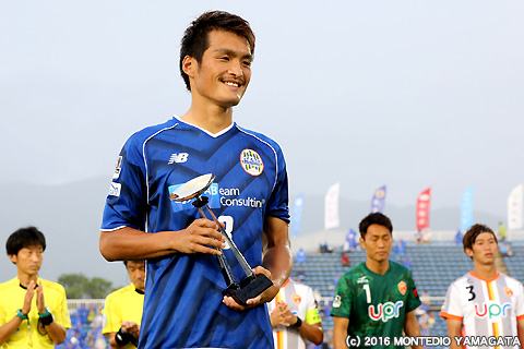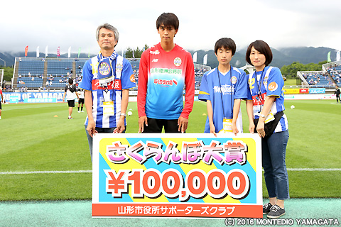 山形市役所サポーターズクラブによる前半戦MVP表彰である「さくらんぼ大賞」に選ばれたのはNo.25汰木康也選手。サポーターの目を引きつけて離さないプレーで期待の若手からチームにとって欠かせない戦力となりました。