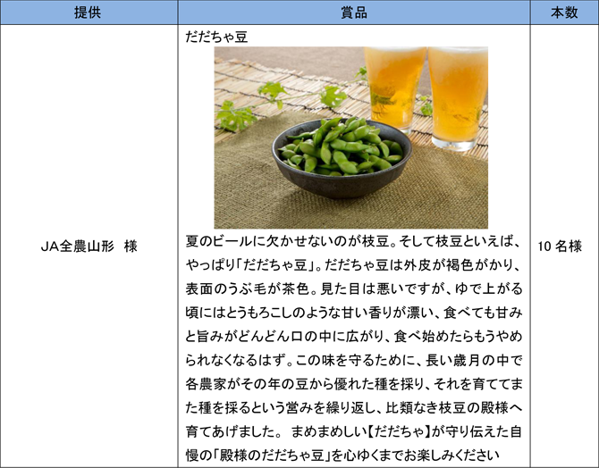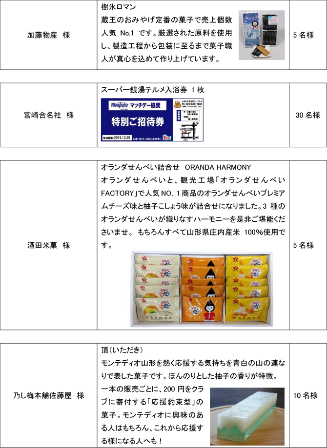 モンテディオ山形の勝利に貢献した選手が表彰されます。また、ご来場いただいたお客様も、「おいしい山形サポーター賞」にご応募いただくと抽選で以下の豪華賞品をお届け!