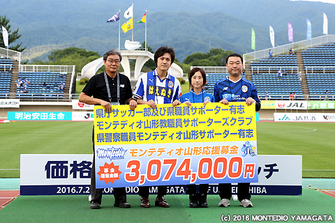 さてモンテディオ山形は地域の皆さん、そして地域の各団体・企業に支えられており、ほぼ毎試合のように贈呈などを頂いておりますが、この試合でも「山形県庁サッカー部及び県職員サポーター有志」「モンテディオ山形教職員サポーターズクラブ」「県警察職員モンテディオ山形サポーターズ有志」の皆様から貴重な応援募金を頂きました。改めて皆様に感謝申し上げます。