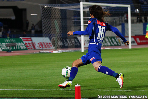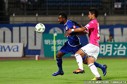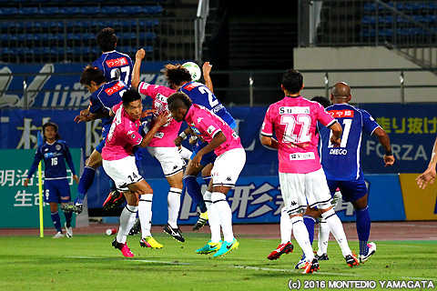 さて前半14分に先制されたモンテディオ山形ですが、同じく前半の40分、田代真一選手のゴールで同点に追いつきます。佐藤優平選手の蹴った左コーナーキックを田代選手がニアサイドでヘディングゴールを決めます。