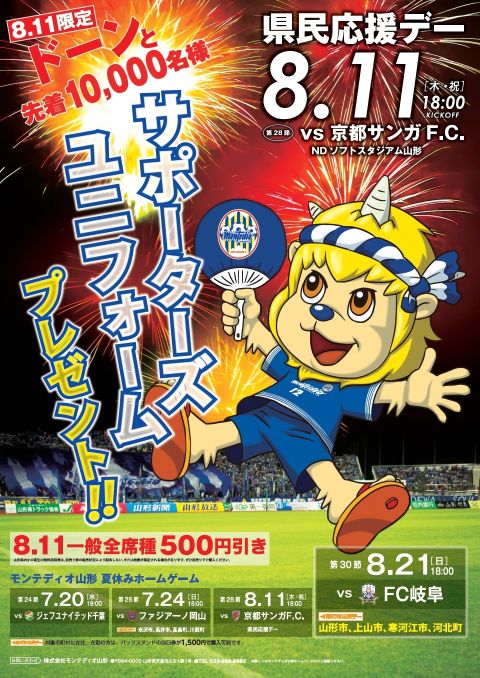 また、8月21日(日)に開催するvs.岐阜戦は、「山形市・上山市・寒河江市・河北町」の市町村応援デーです。対象市町村に在住・在勤の方を対象に、年一回、バックスタンド席一般3,100円(当日価格)のチケットが半額以下の1,500円で購入できる大変お得な試合となっております。ご家族、ご友人お揃いでお越しください。