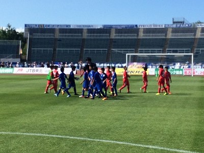 キックオフ前、一歩あゆみよっての握手気合十分です。