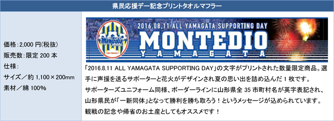 2016年8月11日(木・祝) に開催される2016明治安田生命J2リーグ第28節モンテディオ山形vs京都サンガF.C.において、下記の通り「県民応援デー記念プリントタオルマフラー」を販売いたしますのでお知らせします。観戦の記念や帰省のお土産として是非お買い求めください!
