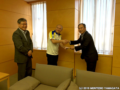 2016年8月4日 荘内銀行山形営業部にて、8月11日に開催される「山形県民応援デー」のサポーター有志によるスタジアムジェット風船への、株式会社荘内銀行様の贈呈式が行われました。