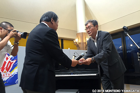 来賓には河北町の田宮町長も来場されていましたが、その場でモンテディオ山形への激励金の贈呈をいただきました。