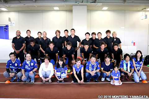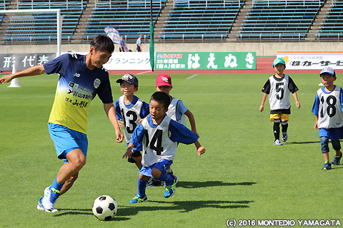 8月最後のホームゲームとなるこの試合、まだまだ残暑の厳しい中の一戦となりました。その強い日差しの中、アイジー工業様協賛のモンテディオ山形サッカースクールが行われます。こちらにはイジェスン選手と写真のクボンヒョク選手も参加。選手たちが戦うピッチに上で、ボールを蹴る楽しさを存分に感じて貰いました。