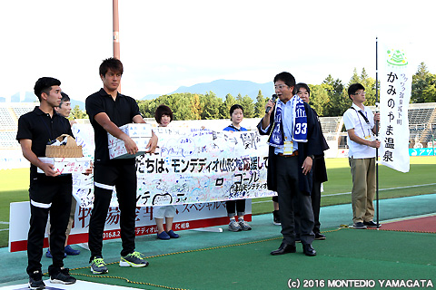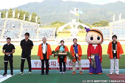 試合前、2016明治安田生命J2リーグ第28節 京都サンガF.C.戦で、Jリーグ通算300試合出場を達成にはディエゴ選手へ表彰が行われます。プレゼンターはディエゴ選手の奥様と三人の子供たちです。