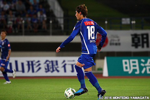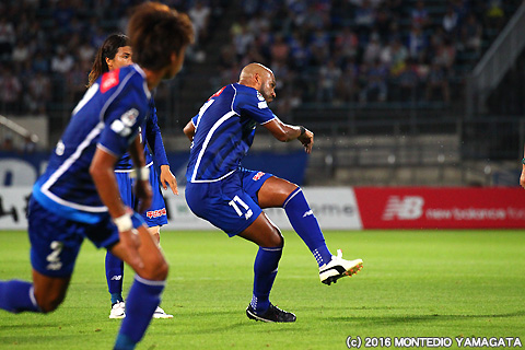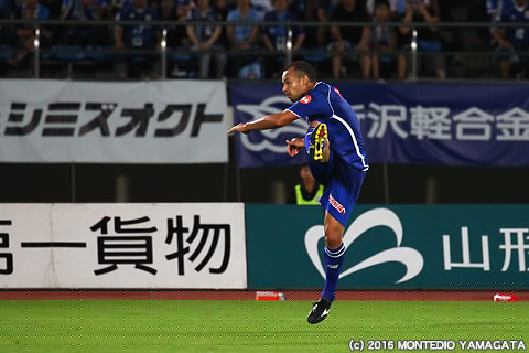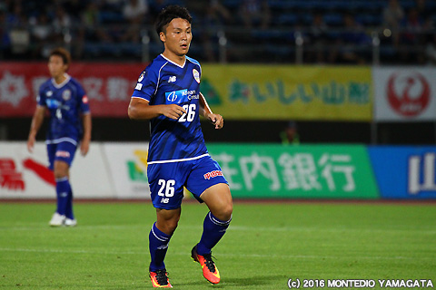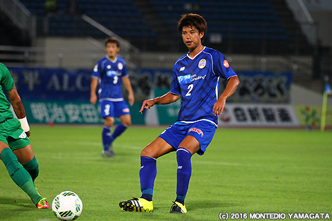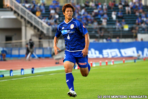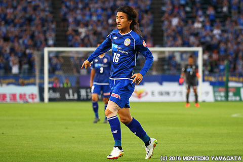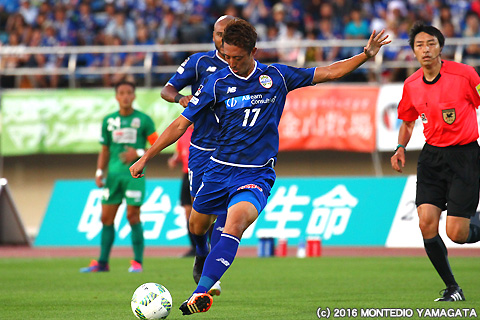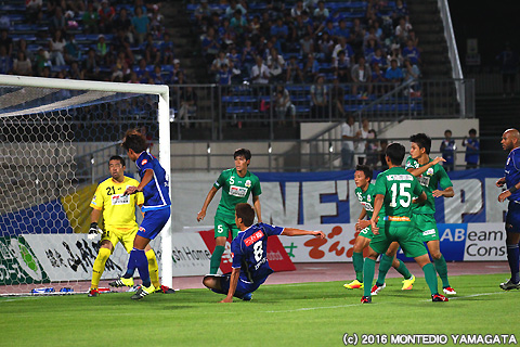さて試合は前半からモンテディオ山形が主導権を握って進めるも、コーナーキックから一度のチャンスを生かされてしまいゴールを許してしまうと、前半を0-1で折り返します。後半、モンテディオ山形の選手たちはさらにゴールを目指してプレーをし続けます。センターバックの田代真一選手も高い位置まで進出すると、攻撃に厚みをもたらします。