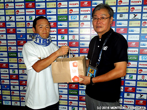 去る2016年8月21日、FC岐阜戦試合前に、弊社正会員の乃し梅本舗 佐藤屋の佐藤慎太郎常務より、リボンマグネット募金52,039円と、モンテディオ山形応援和菓子『頂』の売上の一部として114,600円、合わせて166,639円の贈呈いただきました。