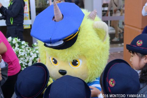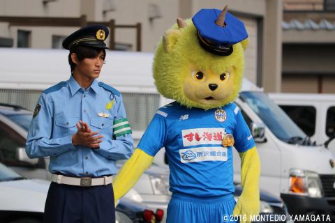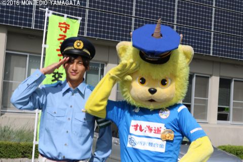 天童警察署様の交通安全運動には、マスコットのディーオも毎年参加していますが、選手の参加は初めて。