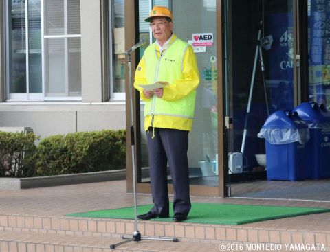 山本信治天童市長、那須和明天童警察署長の挨拶に続き、摂津颯登選手への一日署長への委嘱(任命)式が行われ、摂津選手は、夜光反射材の着用やドライバーへの早めのライト点灯など交通安全への呼びかけを訓示として行いました。