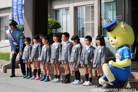 そして、天童東幼稚園の園児たちの交通安全の宣誓、パトカーの出動まで見守る摂津颯登選手とディーオ。
