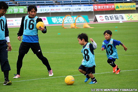 試合前のピッチではモンテディオ山形アカデミーサッカースクールの子供たちがボールを追いかけます。