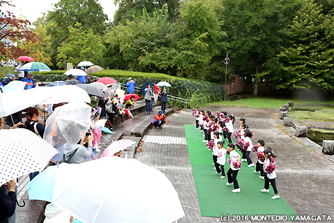 もんてらんど パフォーマンスステージではきらきらチアダンス山形スクールによるパフォーマンスが行われます。あいにくの雨模様の天気でしたが、それを跳ね返す熱いステージで大きな拍手を受けていました。