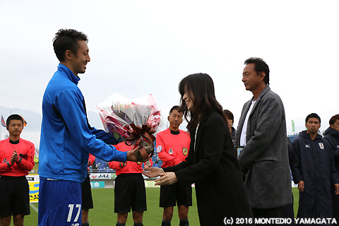試合開始前、Jリーグ通算100試合出場を果たした鈴木雄斗選手への花束贈呈が行われます。プレゼンターはご両親です。節目の100試合となりますが、鈴木雄斗選手はまだ22歳。今後どこまで数字を伸ばすのか、そしてどんな活躍を見せてくれるのか、楽しみな存在です。