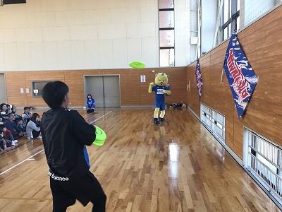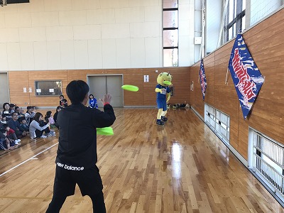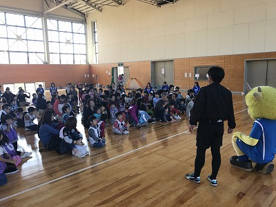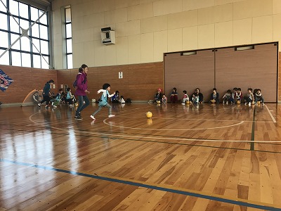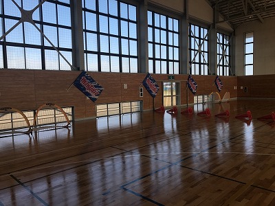 体育館を借りてのサッカー教室。フラッグまで立てていただき、最高の雰囲気で行いました。