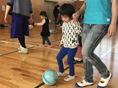 この日は親子一緒のサッカー教室。お父さんお母さんと協力したり、対決したりと、親子サッカーならではの暖かい雰囲気のサッカー教室となりました。