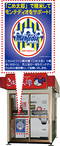 この「こめ太郎」は、100円で10kgのお米を精米することができます。中でも、県内の村山、置賜地域を中心に35台稼働しているのが、モンテディオ山形応援コイン精米機です。こちらで、精米していただくと、クラブに支援金が入るシステムになっています。