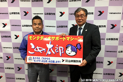 モンテディオ山形のトレーニングウェアスポンサー山本製作所様のコイン精米機「こめ太郎」です。