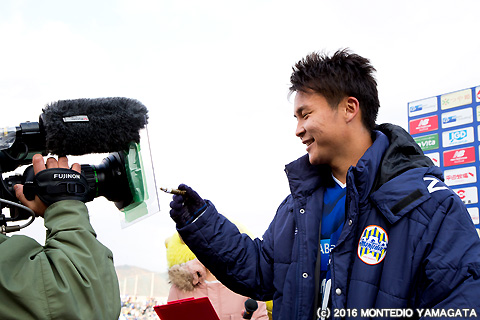 2016明治安田生命J2リーグ第40節vs.V・ファーレン長崎戦の勝利後行われたスカパー!のヒーローインタビュー時に、この試合のヒーローとして永藤歩選手がサインした透明パネルを、YTS山形テレビゴジダスをご覧の方でギラヴァンツ北九州戦を観戦される方に限定プレゼントします!