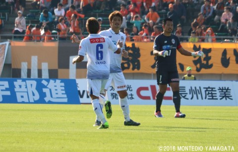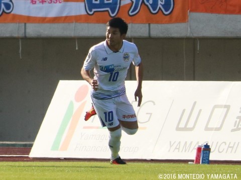 山口 鳥養祐矢選手が山形の左サイドからのクロスを右足でダイレクトに合わせ同点。