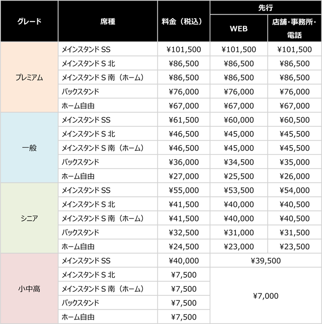※シーズンシート会員・ファンクラブ会員お申し込みの席種の変更・キャンセルなどは、いかなる理由があってもできません。