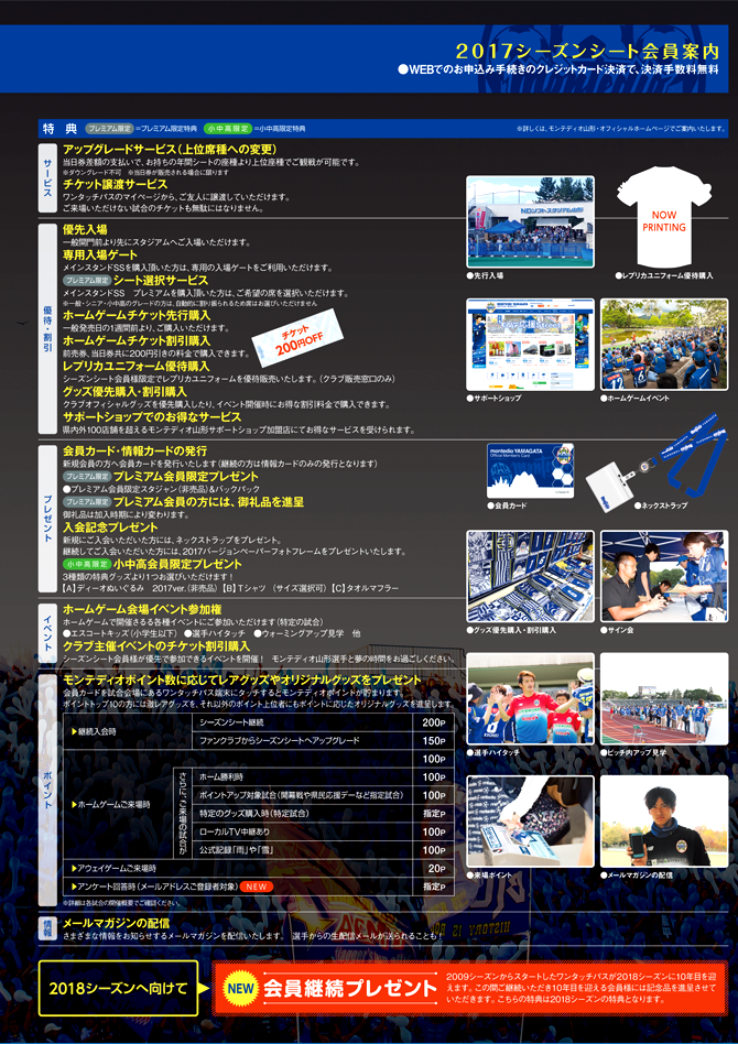 2017シーズンシート会員・ファンクラブ会員料金並びに販売概要をお知らせいたします。