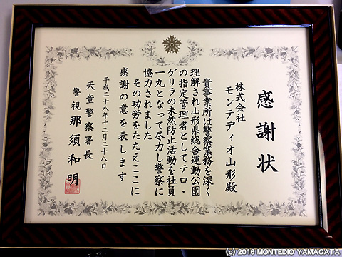 年の瀬も迫る2016年12月28日、ホームタウン山形県天童市の天童警察署にて、弊社株式会社モンテディオ山形が「感謝状」を頂きました。