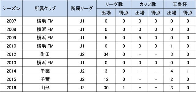 横浜F・マリノスプライマリー菅田→横浜F・マリノスJrユース→横浜F・マリノスユース→横浜F・マリノス→FC町田ゼルビア→横浜F・マリノス→FC町田ゼルビア→横浜F・マリノス→ジェフユナイテッド千葉→モンテディオ山形