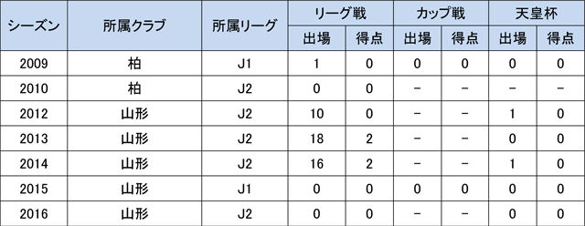柏レイソルU-15→柏レイソルU-18→柏レイソル→ブラウブリッツ秋田→柏レイソル→モンテディオ山形→柏レイソル→モンテディオ山形