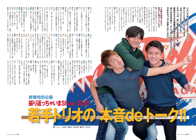 年末恒例の選手3人による座談会「振り返っちゃいまShow2016」は鈴木雄斗選手・摂津颯登選手・永藤歩選手の若手3選手。今年1年の成長ぶりを振り返りながら、ディエゴの飛行機チケット事件などチームの裏事件も暴露してくれました。越智×嶋の「2016シーズン猛反省会」では、今年のモンテディオを6ページにわたって猛反省。課題をすべて洗い出します。