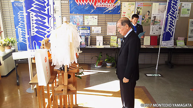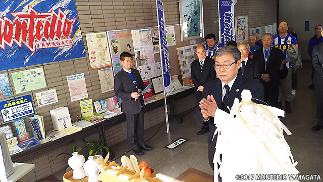 この行事はモンテの必勝とJ1復帰、ならびに地域発展を祈願する祭でこの日も45名ほどの参加で行われました。御祈祷は、天童市城山にある建勲神社の鎌倉宮司がなさいました。