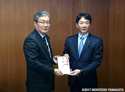 昨日(2/16)、株式会社山形銀行 専務取締役 三浦新一郎 様より、昨シーズン取り扱っていただきました「モンテディオ山形サポーターズ定期預金2016」からのチーム強化費を、弊クラブ代表取締役 森谷俊雄へ贈呈していただきました。