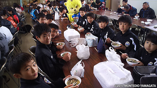 ジュニアユースのみんなも美味しい山菜汁に舌鼓。この後全員がおかわりしてました。