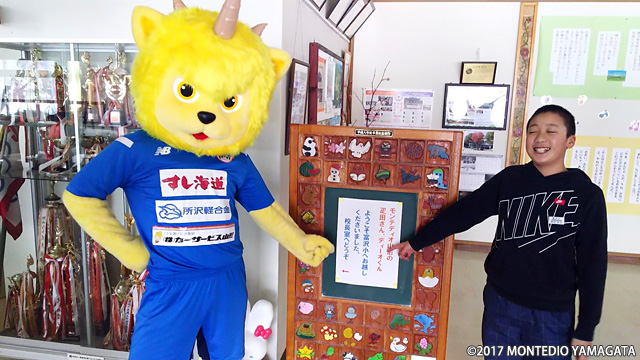 この日はモンテディオ山形応援給食。応援給食とは、食の大切さをディーオと一緒にお勉強するイベントです。玄関にはこんな素敵なウェルカムボードが。
