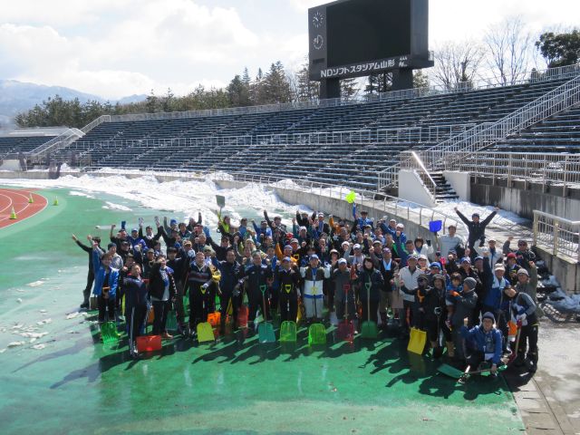 昼食等は各自でご準備ください。除雪用具が不足していますので、各自でお持ちください。スタジアムは、観客席を傷つけないために、プラスチック製の除雪用具が適しています。高校生以上の健康な方のご協力をお願いいたします。(中学生以下の方は危険ですのでご遠慮ください。)防寒着、長靴、汗拭きタオル、飲食物なども各自でご準備願います。