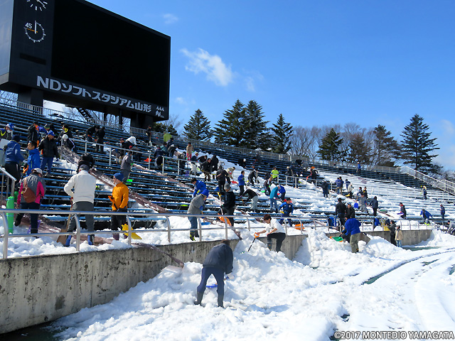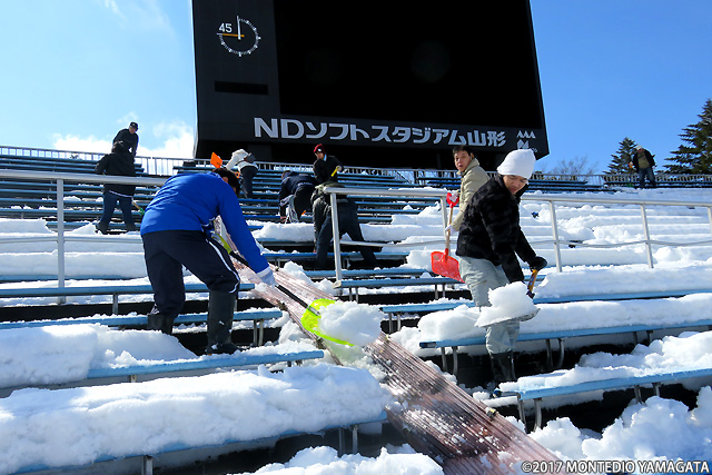 今日は2017年3月11日。春爛漫といった天気の天童市。NDソフトスタジアム山形では、この時期恒例のスタンドの除雪が行われました。
