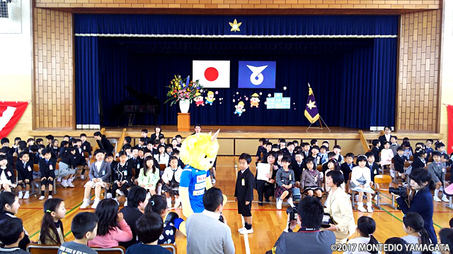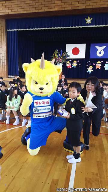 毎年恒例のJAてんどう様とモンテディオ山形がコラボレーションして作製したピッカピカのお弁当箱を、ディーオがピッカピカの新入学生に手渡ししました。「みんなおめでとう!!」とディーオが子供たちにプレゼント。